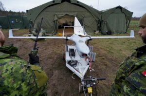 Canadian Armed Forces members of the Artillery unit of NATO Multinational Brigade Latvia look at an RQ-21A Blackjack drone as part of a major field exercise in Adazi, Latvia, November 6, 2024. REUTERS/Janis Laizans