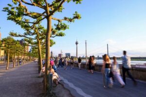 FILE PHOTO: People walk at the promenade by the river Rhine with the skyline in the background including the Rheinturm in Duesseldorf, Germany, May 13, 2024. REUTERS/Jana Rodenbusch/File Photo