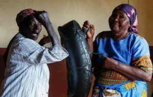 FILE PHOTO: Beatrice Nyariara, 81, trains with Esther Njeri, 82, of the Granny Defence “Cucu Jikinge” program that trains elderly women on the basic Karate skills for self-defence in the wake of the femicide crisis in the Korogocho settlement within Kasarani in Nairobi, Kenya, November 12, 2024. REUTERS/Monicah Mwangi/File Photo