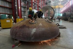 FILE PHOTO: A worker grinds a surface of a metal pipe inside a industrial tank manufacturing factory on the outskirts of Ahmedabad, India, January 31, 2025. REUTERS/Amit Dave/File Photo
