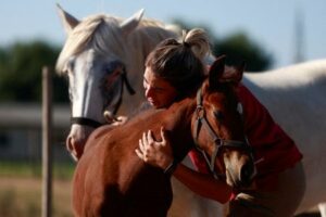 La veterinaria residente Jaklim Leguizamón abraza a un caballo de polo editado genéticamente en San Antonio de Areco, en las afueras de Buenos Aires, Argentina, el 30 de enero de 2025. REUTERS/Matías Baglietto