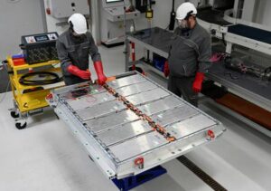FILE PHOTO: Volkswagen employees disconnect old battery systems from all their parts in a battery recycling plant in a pilot line for battery cell production in Salzgitter, Germany, May 18, 2022. REUTERS/Fabian Bimmer/File Photo