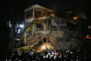 Protesters use an excavator to demolish the Dhanmondi-32 residence of Bangabandhu Sheikh Mujibur Rahman, father of the ousted PM Sheikh Hasina, in Dhaka, Bangladesh February 6, 2025. REUTERS/Mehedi Hasan