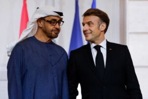 Sheikh Mohamed bin Zayed Al Nahyan, President of the United Arab Emirates and French President Emmanuel Macron talk as they attend an agreement signing ceremony as part of Zayed al-Nahyan’s visit to France at the presidential Elysee palace in Paris, on February 6, 2025. Ludovic Marin/Pool via REUTERS