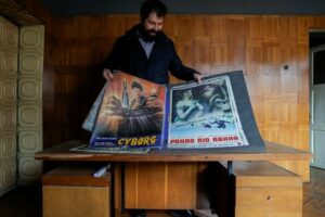 Ares Shporta shows old movie posters at the Lumbardhi cinema,