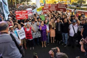 Activists and students pose with some members of the Congress who voted to impeach Philippine Vice President Sara Duterte, at a rally outside the House of Representatives in Quezon City, Metro Manila, Philippines, February 5, 2025. REUTERS/Eloisa Lopez