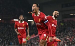 Soccer Football – Carabao Cup – Semi Final – Second Leg – Liverpool v Tottenham Hotspur – Anfield, Liverpool, Britain – February 6, 2025 Liverpool’s Virgil van Dijk celebrates scoring their fourth goal with Mohamed Salah REUTERS/Dylan Martinez