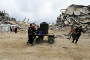 FOTO DE ARCHIVO: Palestinos empujan un carro con un depósito de agua en medio de un alto el fuego entre Israel y Hamás, en el campo de refugiados de Jabalia, en el norte de la Franja de Gaza. 5 de febrero de 2025. REUTERS/Mahmoud Issa/Archivo