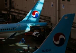FILE PHOTO: A beam of light illuminates he logo of Korean Air airlines on an Airbus A220-300 plane during an organised media tour, at the company’s Maintenance Hangar in Seoul, South Korea, June 27, 2024. REUTERS/Kim Soo-hyeon/File Photo