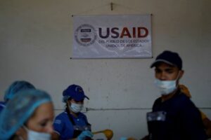 FILE PHOTO: The logo of USAID is seen at a community kitchen set-up by them and the World Food Programme in Cucuta, Colombia February 7, 2019. REUTERS/Marco Bello/File Photo