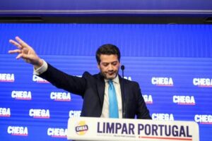FILE PHOTO: Andre Ventura, leader of the far right political party Chega, reacts following results from a general election in Lisbon, Portugal, March 11, 2024. REUTERS/Pedro Rocha/File Photo