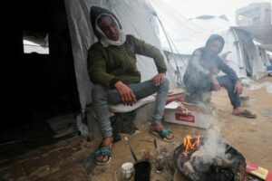 Displaced Palestinians sit at a tent camp on a rainy day, amid a ceasefire between Israel and Hamas, in Gaza City February 6, 2025. REUTERS/Dawoud Abu Alkas
