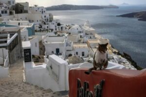 Un gato sentado en el pueblo de Fira, mientras continúa el aumento de la actividad sísmica en la isla de Santorini, Grecia. 7 de febrero de 2025. REUTERS/Louisa Gouliamaki
