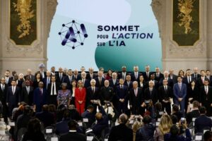 French President Emmanuel Macron, Indian Prime Minister Narendra Modi and United Nations Secretary-General Antonio Guterres pose for a family photo with heads of state and government and business leaders after the plenary session of the Artificial Intelligence (AI) Action Summit at the Grand Palais in Paris, France, February 11, 2025. REUTERS/Benoit Tessier
