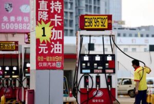 FILE PHOTO: A pump attendant is seen next to a discount advertisement for gasolines at a Petrochina petrol station in Shenyang, Liaoning province, China June 24, 2019. Picture taken June 24, 2019. REUTERS/Stringer/File photo
