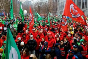 Trabajadores y miembros de sindicatos sostienen banderas durante una huelga nacional en demanda de mejores servicios públicos en Bruselas, Bélgica, el 13 de febrero de 2025. REUTERS/Stephanie Lecocq