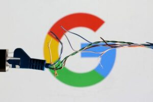 FILE PHOTO: Broken Ethernet cable is seen in front of Google logo in this illustration taken March 11, 2022. REUTERS/Dado Ruvic/Illustration/File Photo