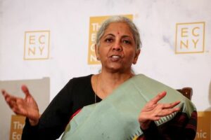 FILE PHOTO: Indian Finance Minister Nirmala Sitharaman speaks to the Economic Club of New York in New York City, U.S., October 21, 2024. REUTERS/Brendan McDermid/File Photo