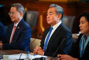 Chinese Ambassador to the United Kingdom Zheng Zeguang, foreign affairs minister of China Wang Yi and vice-minister of foreign affairs of China Hua Chunying attend a meeting in London, Britain. Picture date: Thursday February 13, 2025. James Manning/Pool via REUTERS
