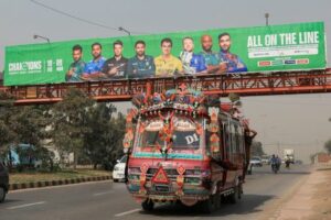 FILE PHOTO: A decorated van drives past under a pedestrian bridge with an advertisment banner, ahead of the ICC Champions Trophy 2025 tournament, in Karachi, Pakistan February 13, 2025. REUTERS/Akhtar Soomro/File Photo