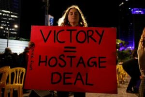 A demonstrator holds a sign as relatives and supporters of Israeli hostages kidnapped during the October 7, 2023 attack by Hamas protest demanding the release of all hostages, in Tel Aviv, Israel, February 14, 2025. REUTERS/Ammar Awad