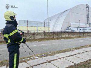 A rescuer measures radiation level next to the New Safe Confinement (NSC) structure, that covers the old sarcophagus which confines the remains of the damaged fourth reactor, after it was hit by a Russian drone strike, amid Russia’s attack on Ukraine, at the Chornobyl Nuclear Power Plant, in Kyiv region, Ukraine February 14, 2025. Press service of the State Emergency Service of Ukraine/Handout via REUTERS
