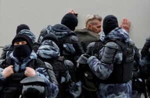 FILE PHOTO: Law enforcement officers detain a person near the Borisovskoye cemetery during the funeral of Russian opposition politician Alexei Navalny in Moscow, Russia, March 1, 2024. REUTERS/Stringer/File Photo