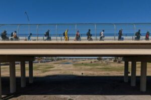 Foto de archivo de un grupo de migrantes cruzando el Camino Real International Bridge para ir a una cita migratoria en Eagle Pass, Texas