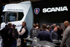 FILE PHOTO: Visitors gather around an electric Scania truck by the Swedish carmaker at the IAA truck show in Hanover, Germany, September 17, 2024. REUTERS/Fabian Bimmer/File Photo