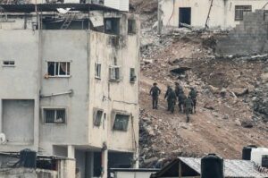 FILE PHOTO: Israeli military members walk during an Israeli army operation in Jenin, in the Israeli-occupied West Bank, February 3, 2025. REUTERS/Raneen Sawafta/File Photo