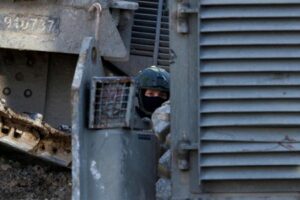FILE PHOTO: Israeli soldier looks on next to military vehicles during an Israeli raid in Tulkarm, in the Israeli-occupied West Bank, December 25, 2024. REUTERS/Mohammad Torokman/File Photo