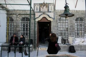 A member of a Syrian Jewish delegation takes a photograph shot of the entrance of a synagogue in a Jewish neighborhood in Damascus, Syria February 18, 2025. REUTERS/Firas Makdesi