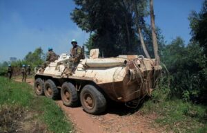 FILE PHOTO: Bangladeshi peacekeepers from the United Nations Organization Stabilization Mission in the Democratic Republic of the Congo (MONUSCO) ride in an armoured personnel carrier (APC) as they patrol to protect internally displaced Congolese people in their farming fields, as part of the secure harvest operation within Dendro, in Ituri province, near North Kivu province of the Democratic Republic of Congo December 11, 2024. REUTERS/Djaffar Al Katanty//File Photo