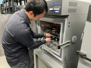 An engineer at Apple loads an iPhone 16e into a chamber that tests the performance of the company’s C1 cellular modem system under a wide range of temperatures for extended periods, at an Apple lab in Sunnyvale, California, U.S., February 18, 2025. REUTERS/Stephen Nellis