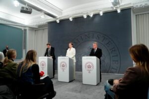 Denmark’s Prime Minister Mette Frederiksen, Defense Minister Troels Lund Poulsen, and Foreign Affairs Minister Lars Loekke Rasmussen hold a press conference in the Mirror Hall at the Prime Minister’s Office in Copenhagen, Denmark February 19, 2025. Ritzau Scanpix/Mads Claus Rasmussen/via REUTERS