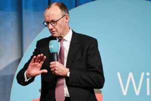 Der deutsche konservative Kanzlerkandidat und CDU-Parteivorsitzende Friedrich Merz macht Wahlkampf in Halle, Deutschland, 18. Februar 2025. REUTERS/Karina Hessland