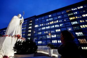A faithful reacts next to the statue of late Pope John Paul II outside the Gemelli Hospital where Pope Francis is admitted to continue treatment for his ongoing respiratory tract infection, in Rome, Italy, February 19, 2025. REUTERS/Yara Nardi TPX IMAGES OF THE DAY
