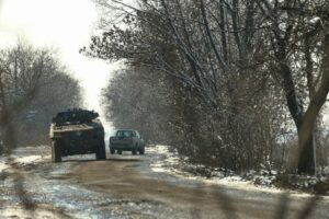 A Ukrainian serviceman drives a Rosomak armoured personnel carrier along a road, amid Russia’s attack on Ukraine, in Dnipropetrovsk region, Ukraine February 18, 2025. REUTERS/Valentyn Ogirenko