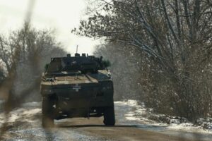 A Ukrainian serviceman drives a Rosomak armoured personnel carrier along a road, amid Russia’s attack on Ukraine, in Dnipropetrovsk region, Ukraine February 18, 2025. REUTERS/Valentyn Ogirenko