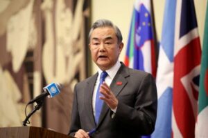 FILE PHOTO: China’s Foreign Minister Wang Yi speaks to the press following a meeting of the United Nations Security Council at the U.N. headquarters in New York City, U.S., February 18, 2025. REUTERS/Brendan McDermid/File Photo
