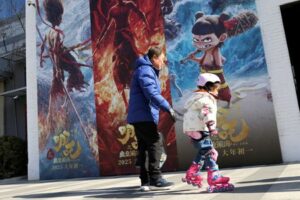 A child skates past promotional posters for the Chinese movie “Nezha 2” outside the office of a film production company in Beijing, China, February 19, 2025. REUTERS/Florence Lo