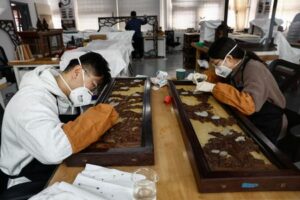 Conservators work at the cultural protection and restoration department of the Palace Museum at the Forbidden City, during an organised media tour, in Beijing, China February 21, 2025. REUTERS/Tingshu Wang