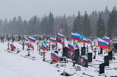 SEMIBRATOVO, Russia (Reuters) – Carved onto slabs of black marble, the names of 11 young men from the Russian town of Semibratovo who died fighting in Ukraine are a stark reminder of a war that is now three years old.
