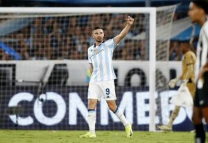 Adrián Martínez festeja tras anotar el segundo gol con el que Racing Club venció a Botafogo en la final de ida de la Recopa Sudamericana. Estadio Presidente Perón, Buenos Aires, Argentina. 20 de febrero de 2025.