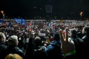 Demonstrators hold up their phones with flashlights on during an anti-government protest in Bratislava, Slovakia, February 21, 2025. REUTERS/Radovan Stoklasa