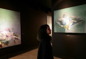 Syrian artist Sara Shamma stands next to her artworks during her retrospective exhibition, ‘Sara Shamma: Echoes of 12 years’ at Damascus National Museum, in Damascus, Syria January 29, 2025. REUTERS/Khalil Ashawi