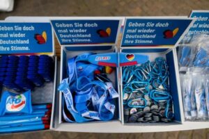 Merchandise of the Alternative for Germany (AfD) party, is seen at an election campaign stand in Bergheim, Germany, February 15, 2025. REUTERS/Jana Rodenbusch