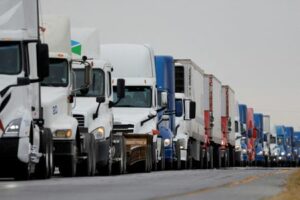 FOTO DE ARCHIVO: Camiones esperan en fila para cruzar a Estados Unidos cerca del control aduanero fronterizo en el Puente del Comercio Mundial, en Nuevo Laredo, México. 26 de noviembre de 2024. REUTERS/Daniel Becerril/Archivo