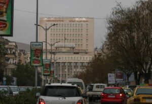 FILE PHOTO: Vehicles drive as the Syrian central bank is seen in the background in Damascus, Syria February 12, 2025. REUTERS/Yamam al Shaar/File Photo
