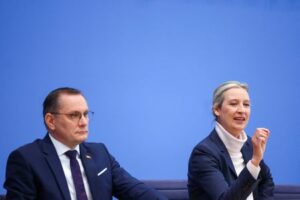 Co-leaders of the far-right Alternative for Germany (AfD) party Alice Weidel and Tino Chrupalla attend a press conference after the German general election in Berlin, Germany February 24, 2025. REUTERS/Lisi Niesner